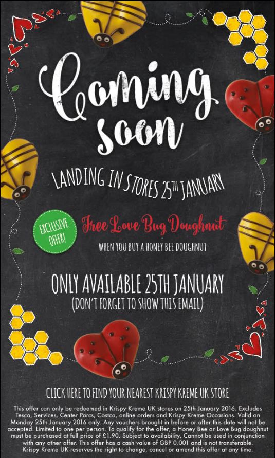 This is a nice romantic gesture from Krispy Kreme. Print off the page linked and take it into your nearest Krispy Kreme anytime after January 25th and before February 14th and they will give you a free Love bug Doughnut when you buy a Honey Bee Doughnut. Romance isn't dead after all!