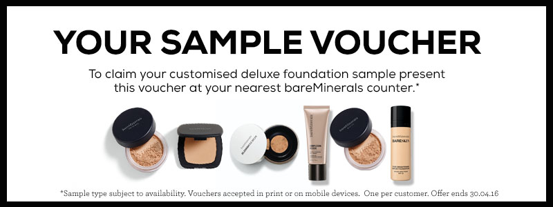 Got a nice voucher here for you. Just print it off on the page linked and take to your nearest bareMinerals counter to claim a free Deluxe Foundation Sample. Offer ends 30th April 2016.